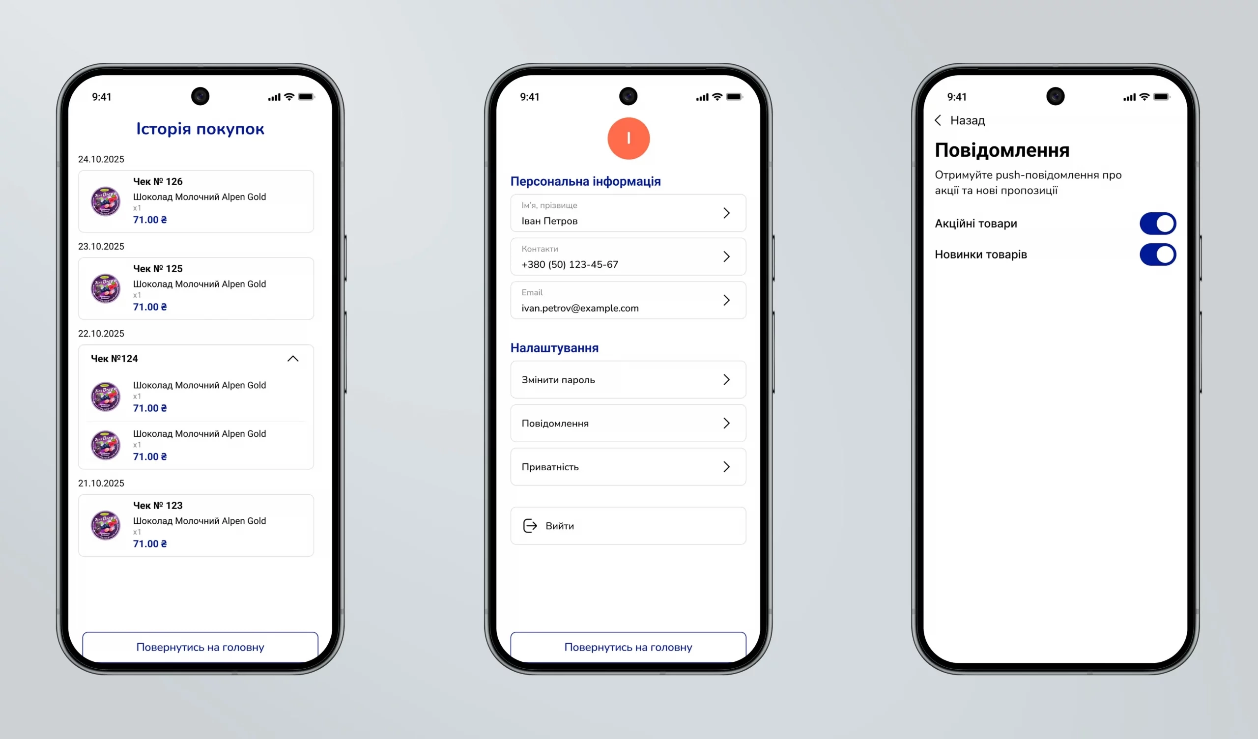 - Digital replacement for plastic loyalty cards: the mobile app enables discounts via barcode scanning and shows purchase history.