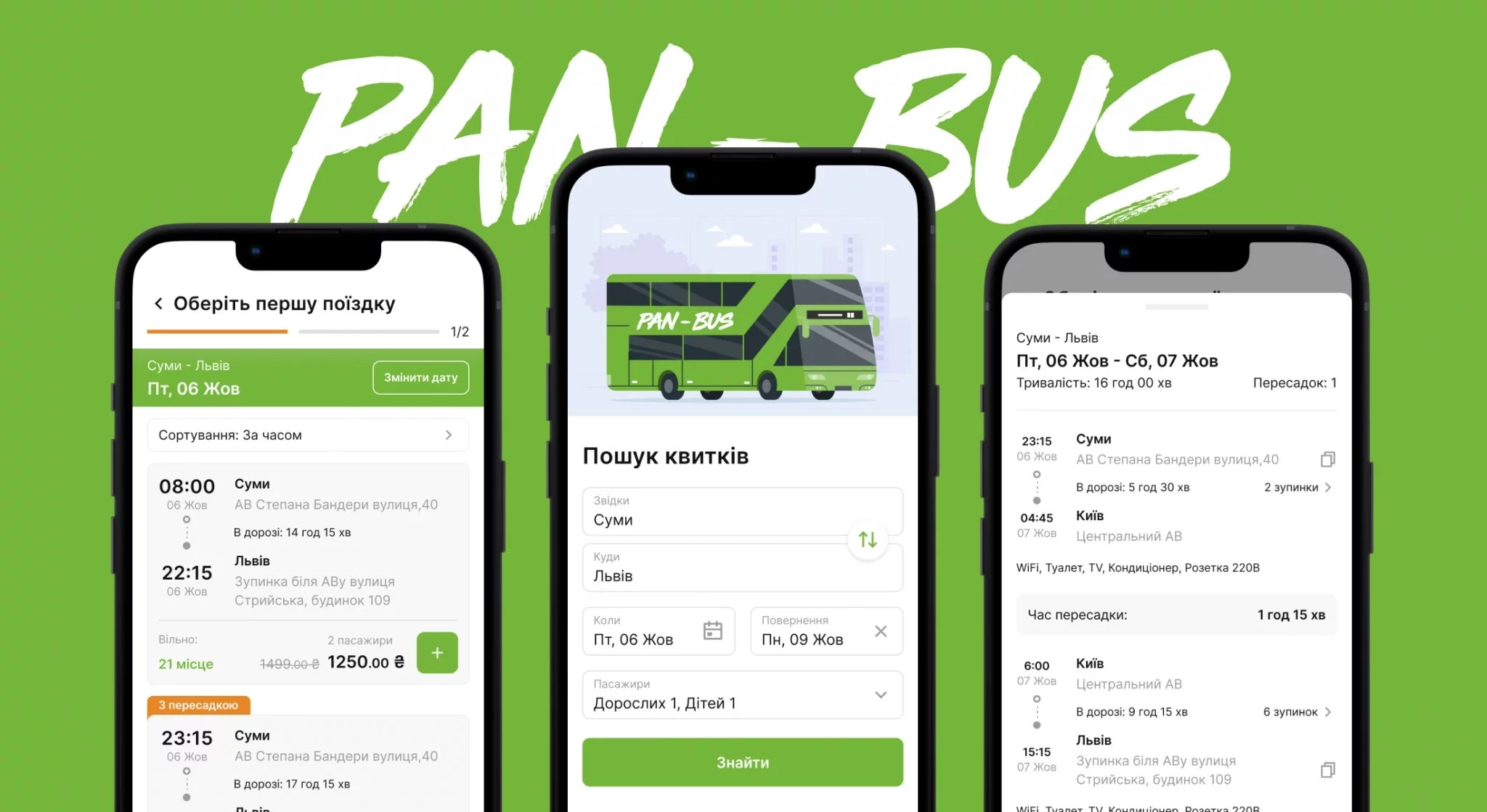 Our team implemented a project to develop a mobile application for the official bus carrier Pan-Bus , which operates routes from Ukraine to Poland and the Czech Republic. The main goal of the development is to create a convenient aggregator of routes and tickets in a mobile format to attract customers, improve the user experience and increase the carrier’s sales. The service works like a ticket office in a smartphone – searching and online booking of tickets in the application is carried out in a couple of clicks.