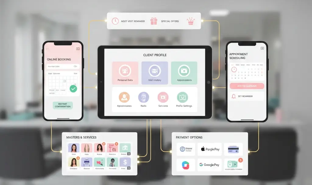 Базовый функционал приложения для любого салона красоты, в том числе элитного, включает:
