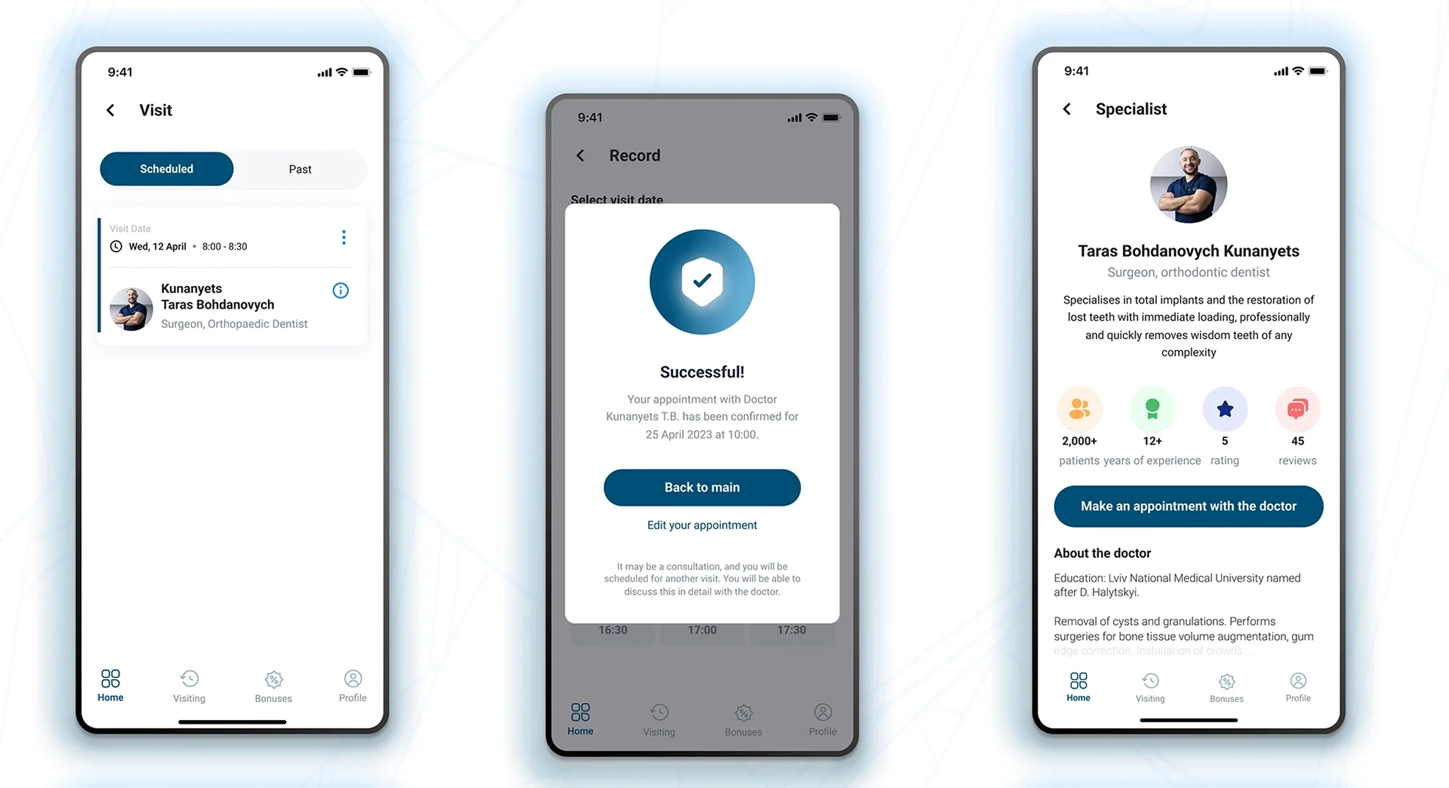 В розробці нашої компанії – мобільний застосунок для стоматологічної клініки BioClinic, яка надає широкий спектр послуг у Львові. Основним запитом замовника було створення зручного мобільного додатка, за допомогою якого пацієнти планують візити в клініку, користуються персональним бонусним рахунком, відстежують прогрес лікування в особистому кабінеті. Головна мета – зробити взаємодію пацієнта з клінікою максимально простою, а послуги – доступними та прозорими. Для цього ми створили зручну структуру та функціонал, який вирішує задачі пацієнта і допомагає клініці досягти поставлених цілей.
