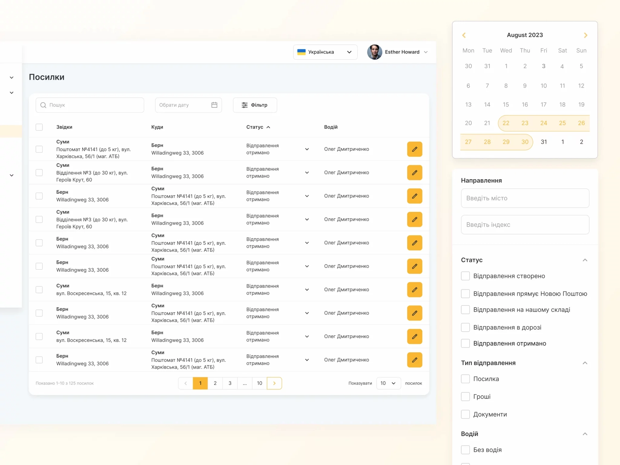 - список актуальних відправлень з зазначенням місця призначення, інформації про вантаж, контактних даних отримувача та коментарів відправника;