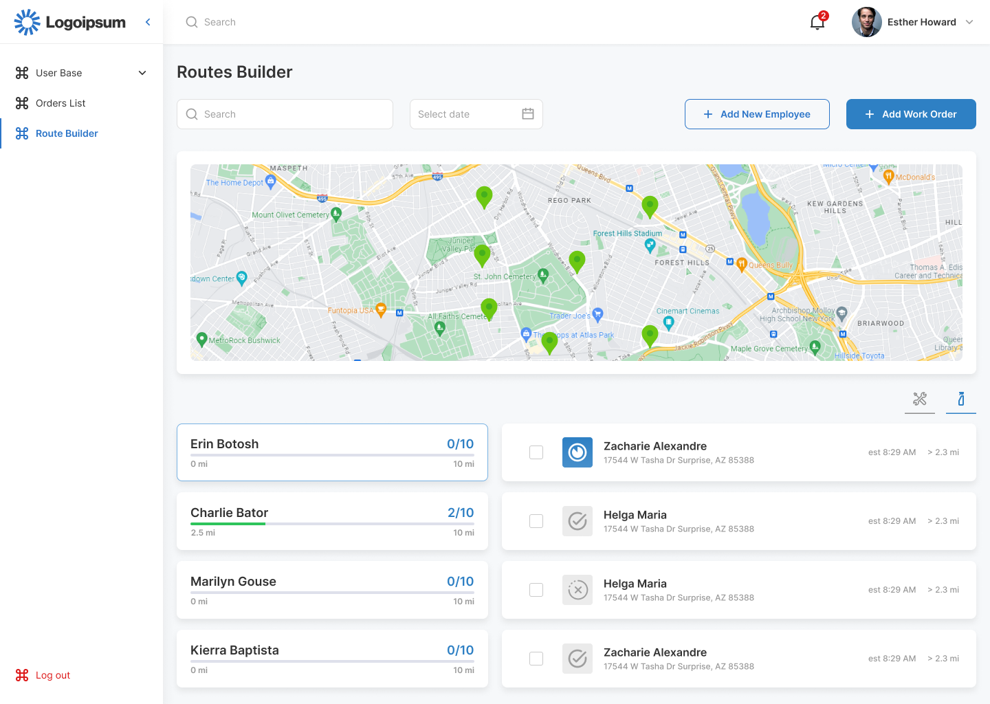 - База клієнтів. Менеджеру доступний перелік клієнтів з інформацією про їх замовлення та залучених співробітників. До кожного клієнта прикріплюється план виконання робіт, побудовані маршрути, звітність та інша інформація, яка стосується замовлень конкретного клієнта.